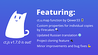 β¨ New Features Add custom properties modal for copies (#275 by @firecakes) Added map() function to ct.u (#274 by @qewer33) Clone projects from the starting screen β‘οΈ General Improvements π Up...